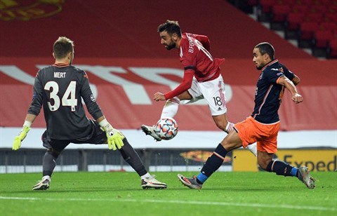 | Le milieu portugais de Manchester United, Bruno Fernandes (centre), auteur d'un doublé lors du match de groupes de la Ligue des champions à domicile contre Istanbul Basaksehir, le 24 novembre. |