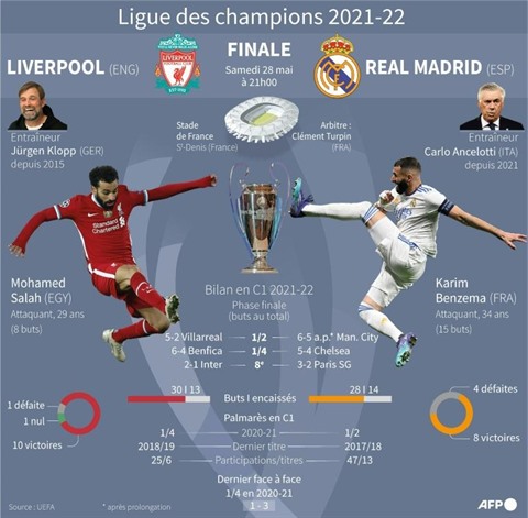 Karim Benzema contre Sadio Mané, Carlo Ancelotti face à Jürgen Klopp, la revanche de Mohamed Salah, des dizaines de milliers de fans arrivés d'Angleterre et d'Espagne dans la capitale française : tout est prêt pour "le match le plus important du football mondial", comme le dit l'entraîneur italien.