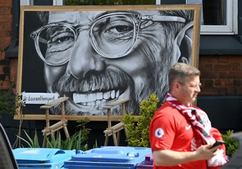 | Une peinture murale à l'effigie de Jurgen Klopp, l'emblématique entraîneur de Liverpool, près du stade d'Anfield Road, le 24 avril à Liverpool. |