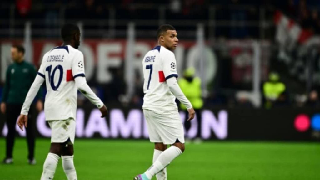 | Les attaquants du Paris SG Ousmane Dembélé (gauche) et Kylian Mbappé, lors de la défaite face au Milan AC (2-1), le 7 novembre à San Siro. |