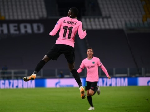 | L'attaquant français du Barcelone, Ousmane Dembélé, exulte après son but lors du match de groupes de C1 face à la Juventus, à Turin, le 28 octobre. |