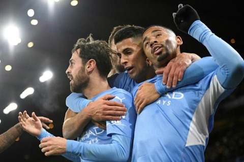 | La joie de l'attaquant brésilien de Manchester City, Gabriel Jesus (droite), félicité par ses coéquipiers, après avoir marqué le 2e but à domicile face au PSG, le 24 novembre à l'Etihad Stadium. |