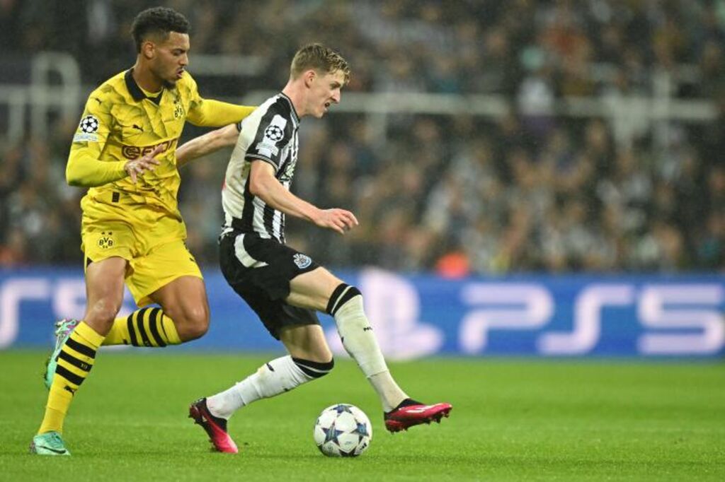 | Le milieu de Newcastle Anthony Gordon (droite) devance le milieu de Dortmund Felix Nmecha, le 25 octobre à Newcastle. |