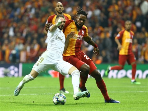 | L'attaquant du Real Madrid Karim Benzema (gauche) à la lutte avec le défenseur de Galatasaray Christian Luyindama en Ligue des champions, le 22 octobre à Istanbul. |