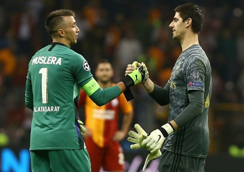 | Le gardien de but de Galatasary Fernando Muslera (gauche) et celui du Real Madrid Thibaut Courtois à la fin du match de Ligue des champions le 22 octobre à Istanbul. |