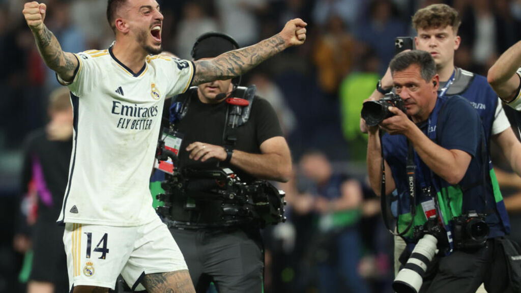| Le joueur du Real Madrid Joselu après la victoire de son équipe en demi-finale de Ligue des champions contre le Bayern Munich, le 8 mai au stade Santiago Bernabéu de Madrid. |
