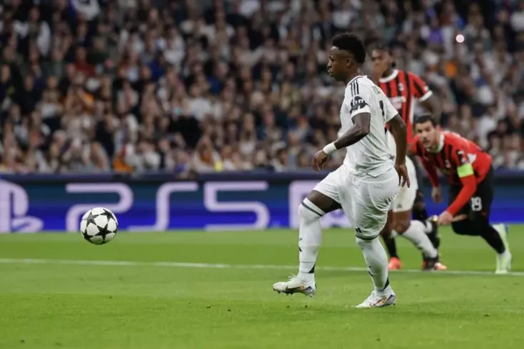 | L'attaquant brésilien du Real, Vinicius Junior, égalise contre l'AC Milan d'une panenka sur penalty, en Ligue des champions, le 5 novembre à Madrid. |