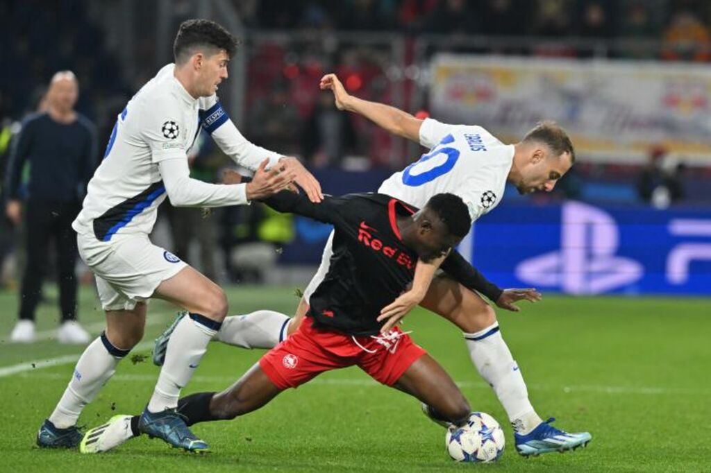 | De gauche à droite : le défenseur de l'Inter Milan Alessandro Bastoni, l'attaquant de Salzbourg Karim Konaté et le défenseur de l'Inter Carlos Augusto luttent pour le ballon lors du match de C1. |