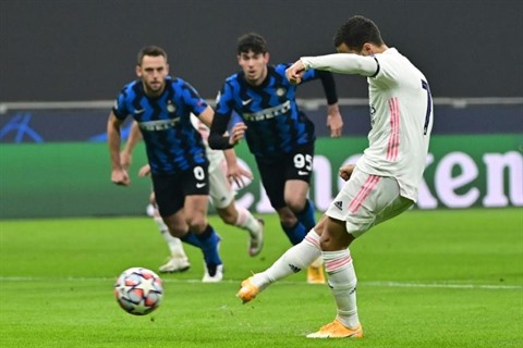 | L'attaquant belge du Real Madrid, Eden Hazard, buteur sur penalty lors du match de groupes de la Ligue des champions sur la pelouse de l'Inter Milan, le 25 novembre. |