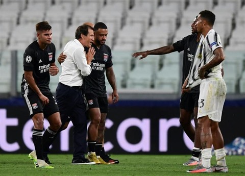 | La joie des Lyonnais et de leur entraîneur Rudi Garcia après la qualification pour les quarts de finale de la Ligue des champions aux dépens de la Juventus, le 7 août à Turin |