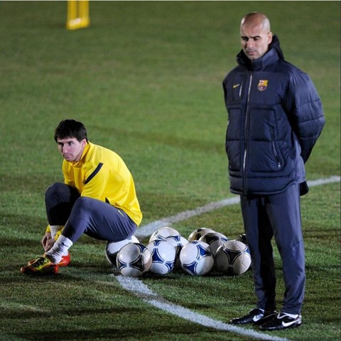 | Le jeune Lionel Messi à l'entraînement avec son entraîneur au FC Barcelone Pep Guardiola, le 12 décembre 2011 à Yokohama (Japon). |