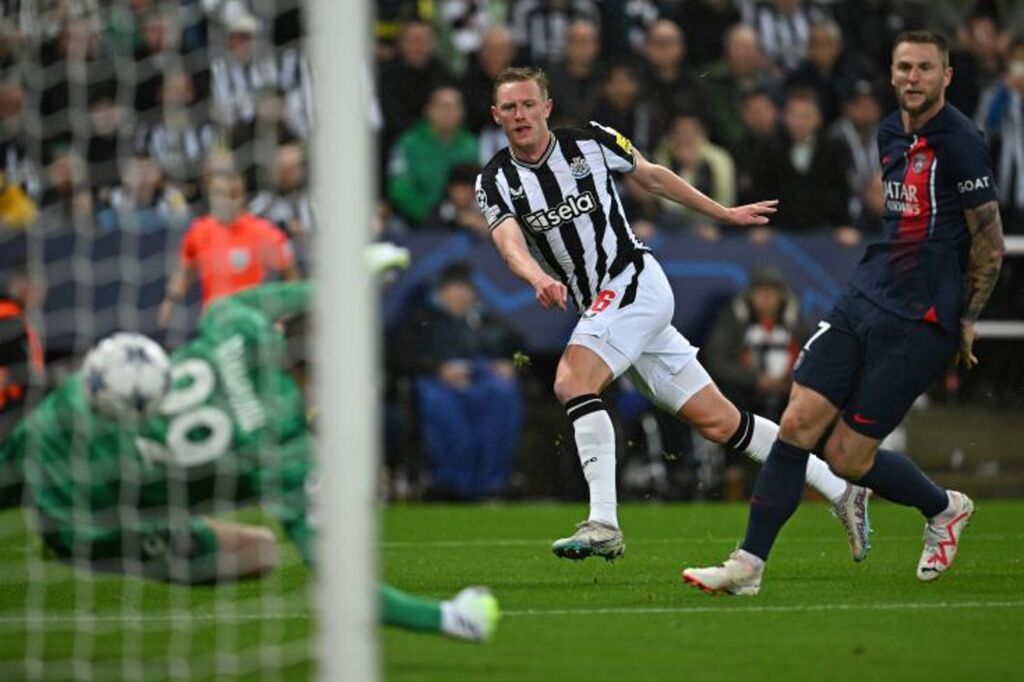 | Le milieu de Newcastle Sean Longstaff (centre) trompe le gardien parisien Gigi Donnarumma (gauche), le 4 octobre à Newcastle. |