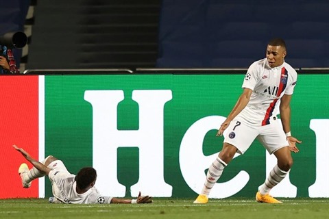 | La joie de Kylian Mbappé et Neymar après le but de la qualification du PSG contre l'Atalanta Bergame à Lisbonne, le 12 août. |