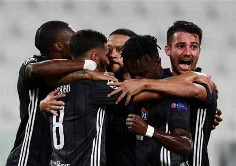 | Des joueurs de l'Olympique lyonnais félicitent Memphis Depay après son pénalty inscrit contre la Juventus Turin en 8e de finale retour de la Ligue des champions le 7 août à Turin. |