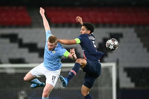 | Kevin De Bruyne le milieu de Manchester City à la lutte avec Marquinhos du Paris SG au Parc des Princes à Paris le 28 avril. |