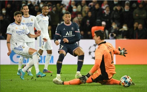 | L'attaquant du PSG, Kylian Mbappé, marque l'unique but du match face au gardien de but belge du Real Madrid, Thibaut Courtois, lors de leur 8e de finale aller de C1, le 15 février au Parc des Princes. |