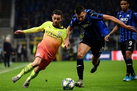 | Le milieu portugais de Manchester City, Bernardo Silva (gauche), à la lutte avec le défenseur albanais de l’Atalanta Bergame, Berat Djimsiti, en C1, le 6 novembre au stade San Siro à Milan. |