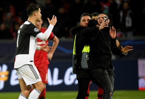 | L'attaquant de la Juventus, Cristiano Ronaldo, importuné par un supporteur entré sur la pelouse, à la fin du match à Leverkusen, le 11 décembre. |
