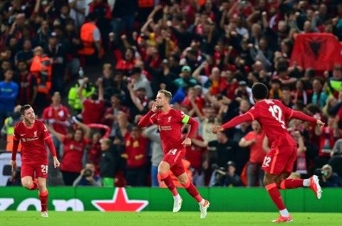 | Le capitaine de Liverpool, Jordan Henderson (centre), célèbre son but de la victoire contre l'AC Milan en Ligue des champions le 15 septembre à Liverpool. |