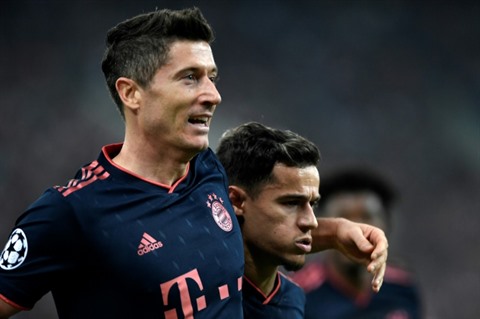 | Les attaquants du Bayern Munich Robert Lewandowski (gauche) Philippe Coutinho après un but du premier en Ligue des champions contre Olympiakos, le 22 octobre au Pirée. |