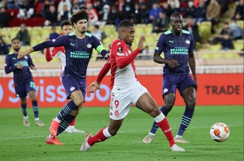 | L'attaquant néerlandais de Monaco, Myron Boadu (centre), contre le PSV Eindhoven en Ligue Europa, le 4 novembre au stade Louis-II. |