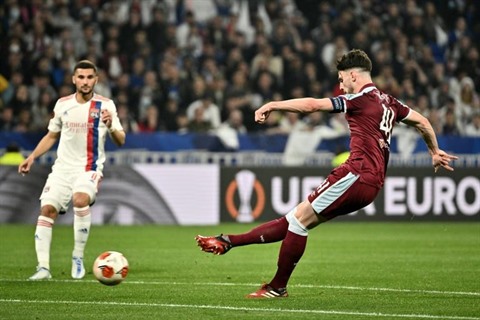 | Le capitaine de West Ham, Declan Rice (droite), inscrit le 2e but de son équipe contre Lyon à Décines-Charpieu, le 14 avril. |