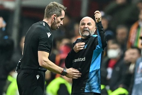 | L'entraîneur de Marseille, l'Argentin Jorge Paoli, proteste face à l'arbitre allemand Tobias Stieler, lors du match de poules de la Ligue Europa Conférence contre Galatasaray, le 25 novembre à Istanbul. |