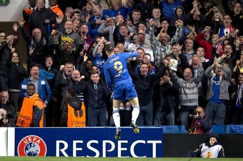 | L'attaquant espagnol de Chelsea, Fernando Torres, célèbre son but contre Bâle à Stamford Bridge le 2 mai 2013. |
