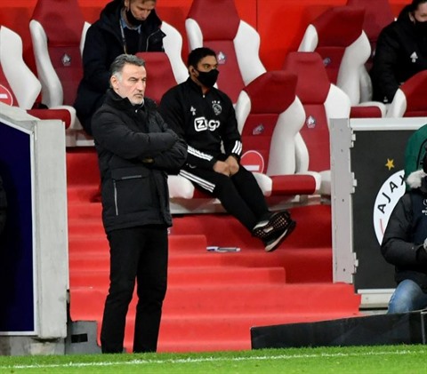 | L'entraîneur de Lille, Christophe Galtier, lors du 16e de finale aller de la Ligue Europa contre l'Ajax Amsterdam, le 18 février à Villeneuve-d'Ascq. |