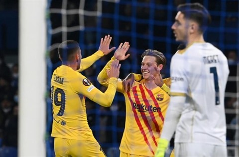 | La joie du milieu de terrain néerlandais du FC Barcelone, Frenkie De Jong (centre), après avoir marqué le 2e but face à Naples, lors du match du 24 février. |