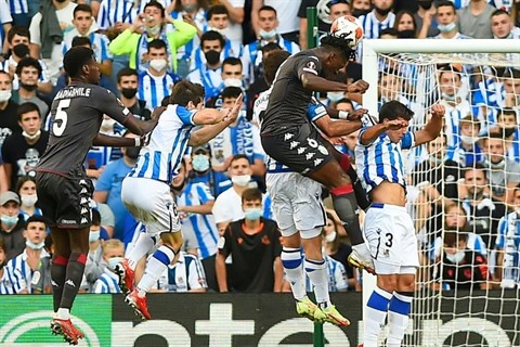 | Le capitaine de Monaco Axel Disasi (centre) ouvre le score de la tête contre la Real Sociedad en Ligue Europa, le 30 septembre à Saint-Sébastien. |