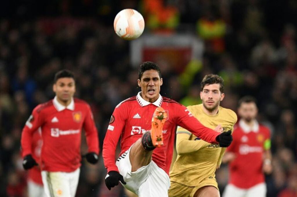 | Le défenseur de Manchester United, Raphaël Varane, contre Barcelone, le 23 février à Manchester. |