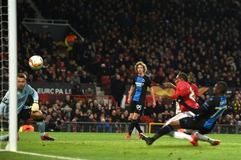 | L'attaquant nigérian de Manchester United, Odion Ighalo (droite), marque le 2e but lors du 16e de finale de la Ligue Europa face au FC Bruges, à Manchester, le 27 février. |