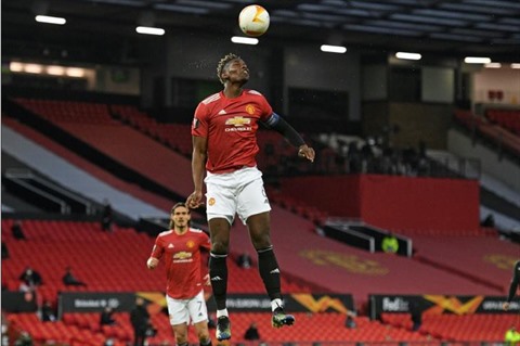 | Paul Pogba avec Manchester United face à Grenade en quart de finale de Ligue Europa, le 15 avril à Old Trafford. |