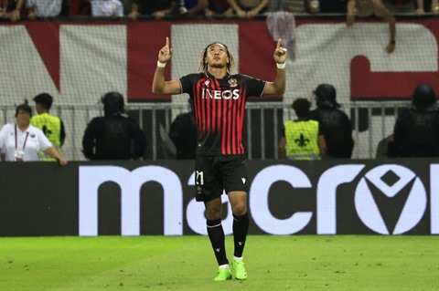 | Le Niçois Alexis Beka Beka célèbre son but, qui a permis de battre le Maccabi Tel Aviv 2 à 0 et de qualifier son club pour la phase de groupes de la Ligue Europa Conférence, jeudi 25 août |