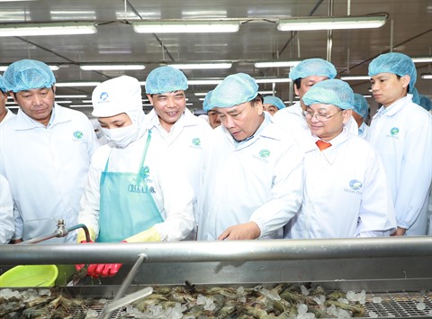 | Le Premier ministre Nguyên Xuân Phuc (2e, droite) visite le 5 février un atelier de la société Minh Phu, le plus grand exportateur de crevettes. |