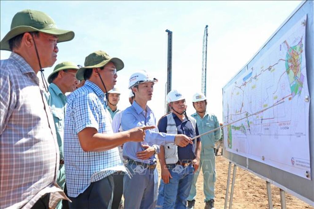| Le secrétaire du Comité provincial du Parti, Nguyên Tiên Hai (2e à gauche), inspecte les travaux du tronçon Hâu Giang-Cà Mau relevant du projet d'autoroute Nord-Sud, période 2021-2025. |