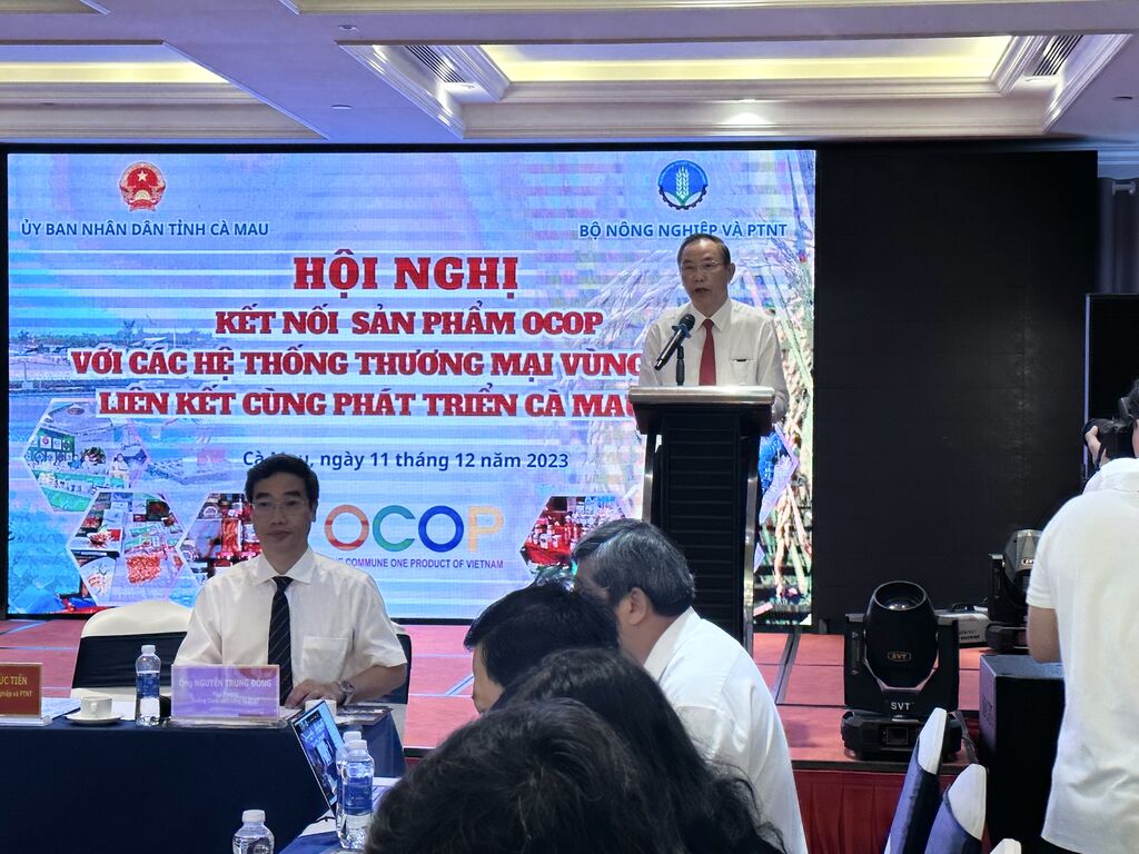 | Le vice-ministre de l’Agriculture et du Développement rural, Phung Duc Tiên, présente les potentiels des produits OCOP de Cà Mau et des villes et provinces du delta du Mékong. |
