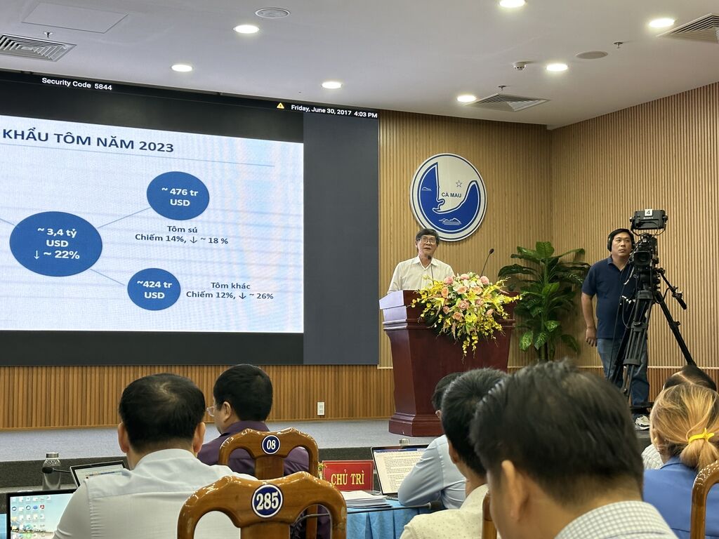 | Nguyên Van Trung, directeur adjoint du Sous-service de developpement des produits aquatiques de Cà Mau, présente le 14 décembre un exposé sur la nécessité d’établir des chaînes de valeur pour la crevetticulture. |