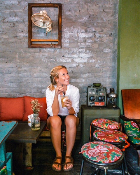 | Kelsey Madison apprécie le café vietnamien dans un café à Hanoï. |