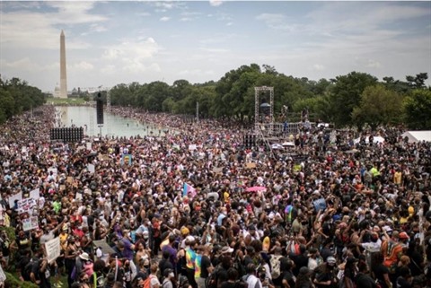 Intitulée "Enlevez votre genou de nos cous", le mot d'ordre de la manifestation faisait référence à la mort de George Floyd, un quadragénaire noir asphyxié par un policier blanc le 25 mai à Minneapolis, dont le calvaire a déclenché un mouvement de protestation inédit depuis des décennies aux États-Unis.