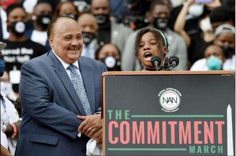 | Yolanda King, petite-fille de Martin Luther King Jr, et son père l'avocat Martin Luther King III (centre), au Mémorial de Lincoln lors d'une manifestation antiraciste, le 28 août 2020 à Washington. |