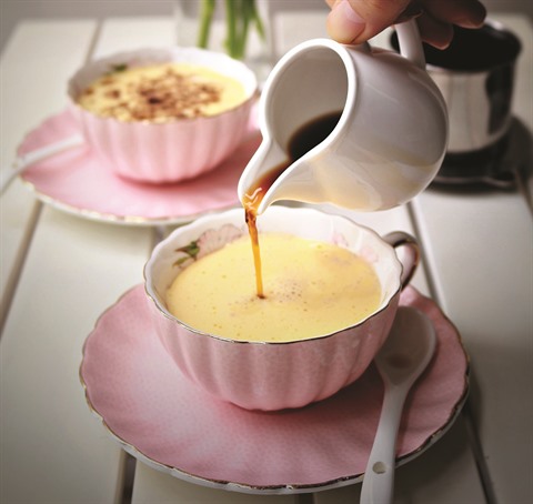 - Dans une tasse, verser le lait condensé, puis le jaune d’œuf bien monté et le café chaud.