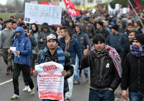 | Manifestation en soutien aux migrants du camp de la "Jungle", réclamant "des conditions d'accueil dignes", le 23 janvier à Calais (Nord de la France). |