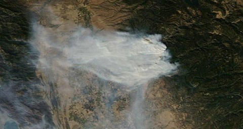 | Image publiée par la NASA le 13 novembre montrant les fumées propagées par un gigantesque incendie dans le nord de la Californie. |