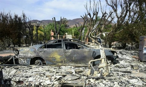| Une machine d'exercice et deux véhicules ont été entièrement calcinés par un incendie qui a frappé la célèbre station balnéaire de Malibu, à l'ouest de Los Angeles (Californie), le 13 novembre. |
