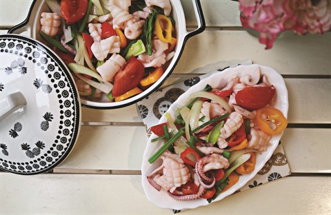 - Faire chauffer l’huile végétale dans un wok, ajouter une pointe d’ail haché, puis faire sauter les blancs de calamar pendant 10 minutes. Ajouter le sel et les légumes. Remuer pendant 5 minutes.