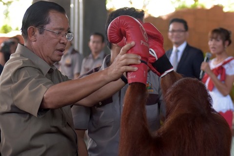 Le Premier ministre cambodgien Hun Sen, en campagne électorale, avec un ourang-outan après un spectacle au nouveau zoo de Phnom Penh, le 23 juin. Photo: AFP/VNA/CVN |