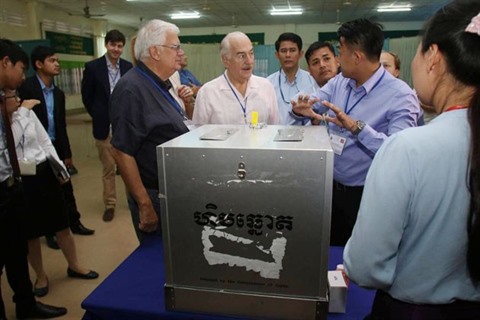 | Des observateurs internationaux dans divers bureaux de vote dans la ville de Takhmao, le 4 juin. |