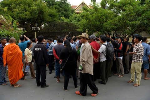 | Des partisans du chef de l'opposition cambodgienne, Kem Sokha, sont rassemblés près de son domicile à Phnom Penh, le 10 septembre. |